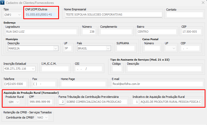 Sendo o Produtor Rural Pessoa Jurídica (CNPJ), em seu cadastro poderá informar o CPF correspondente para que as informações sejam geradas sobre a Pessoa Física. As alíquotas geradas para o Funrural Pessoa Física e Pessoa Jurídica são distintas.