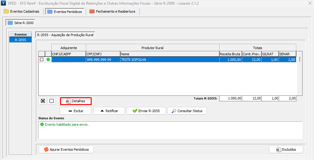 9. O evento será habilitado para envio. Na opção Detalhes confira se todas as informações foram geradas corretamente;
