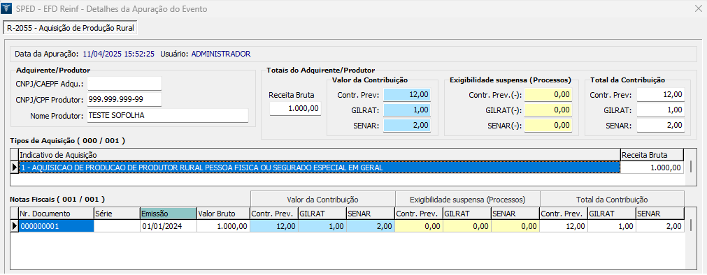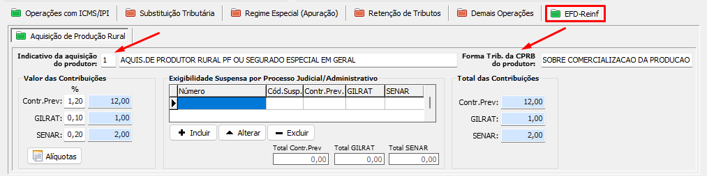 5. Observe no exemplo abaixo, a palheta EFD Reinf  > Aquisição de Produtor Rural, estará habilitada, e o Indicativo da Aquisição e Forma Trib. da CPRB do Produtor será apresentado conforme informados no cadastro do Produtor Rural;