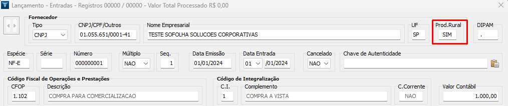 4. Clique em Incluir no rodapé da tela e dê início ao lançamento, informando cada campo conforme o documento fiscal. O campo Prod.Rural estará informado SIM, conforme a indicação do cadastro na opção anterior;