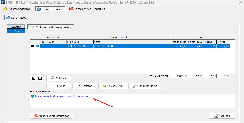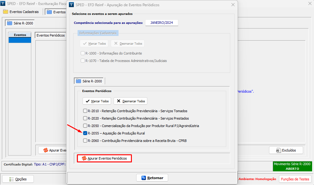 8. Na tela seguinte, marque o evento R-2055 e clique em Apurar Eventos Periódicos;