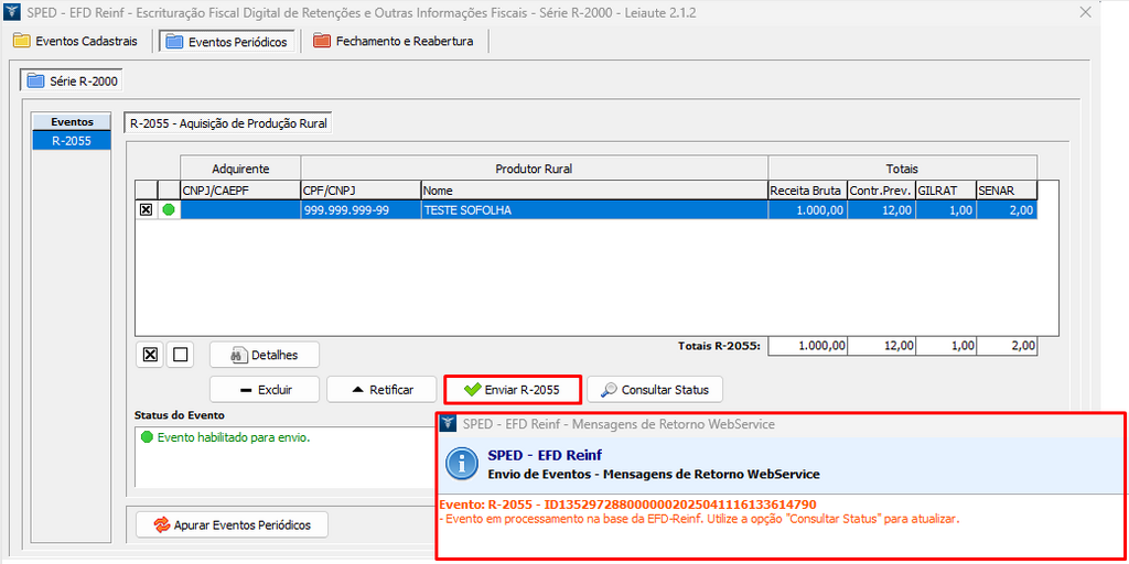 10. Retorne, selecione o evento e clique na opção Enviar R-2055. O Evento ficará em processamento na base da EFD Reinf;