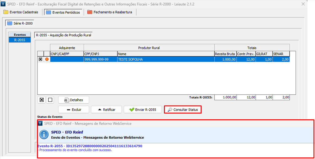 11. Na tela seguinte selecione novamente o evento, clique na opção Consultar Status. Após esta consulta, caso não sejam apresentados erros o processamento do evento será concluído com sucesso.