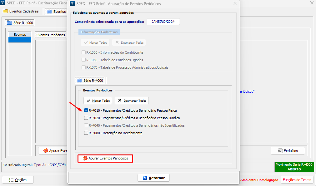 6. Na tela seguinte, marque o evento R-4010 e clique em Apurar Eventos Periódicos;