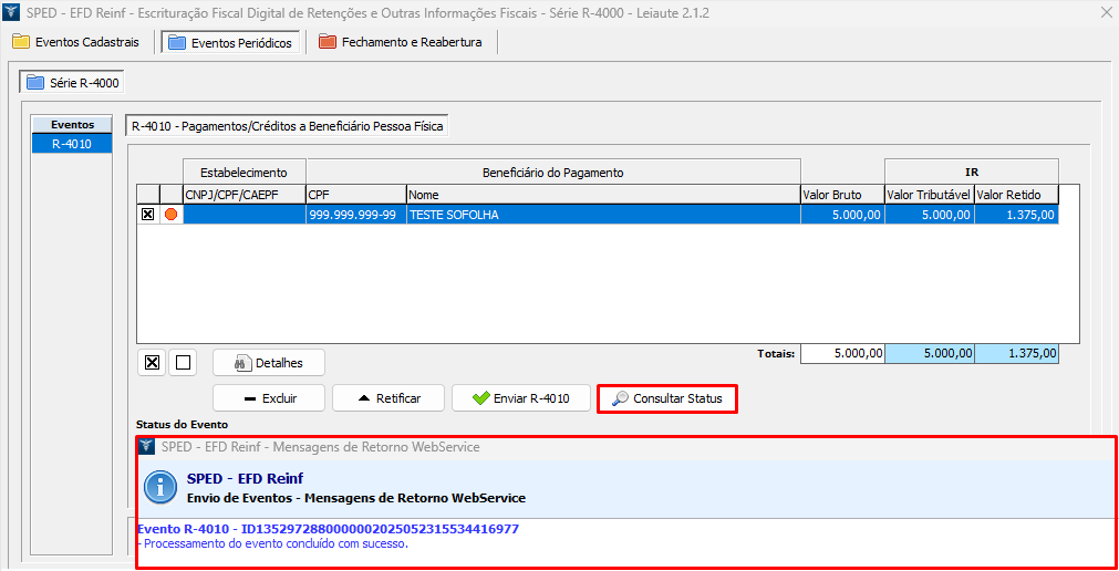 8. Retorne, selecione o evento e clique na opção Enviar R-4010. O Evento ficará em processamento na base da EFD Reinf;