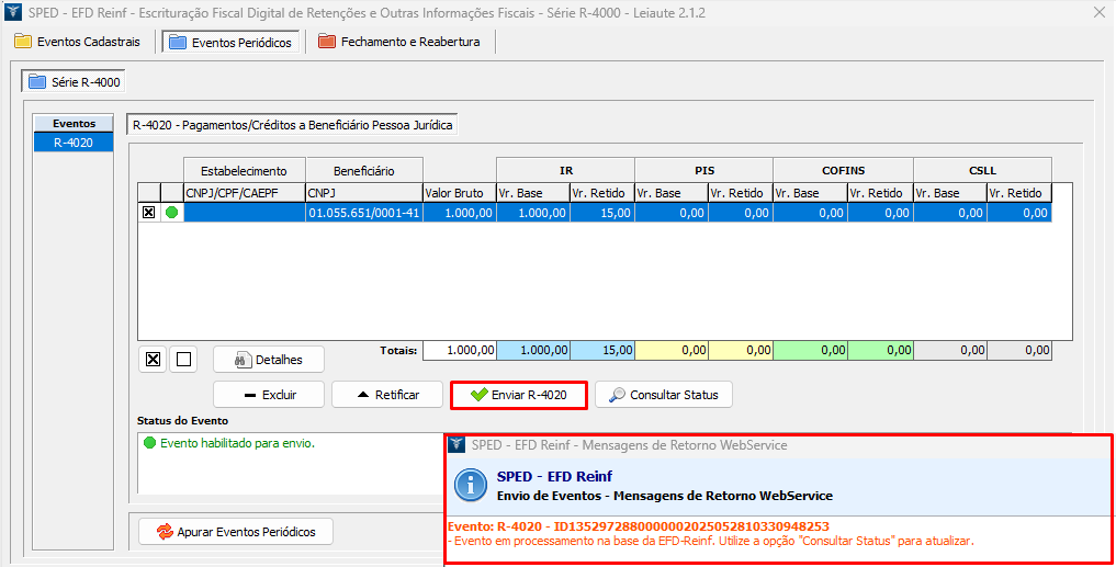 9. Retorne, selecione o evento e clique na opção Enviar R-4020. O Evento ficará em processamento na base da EFD Reinf;