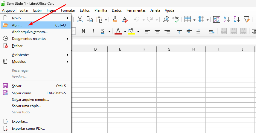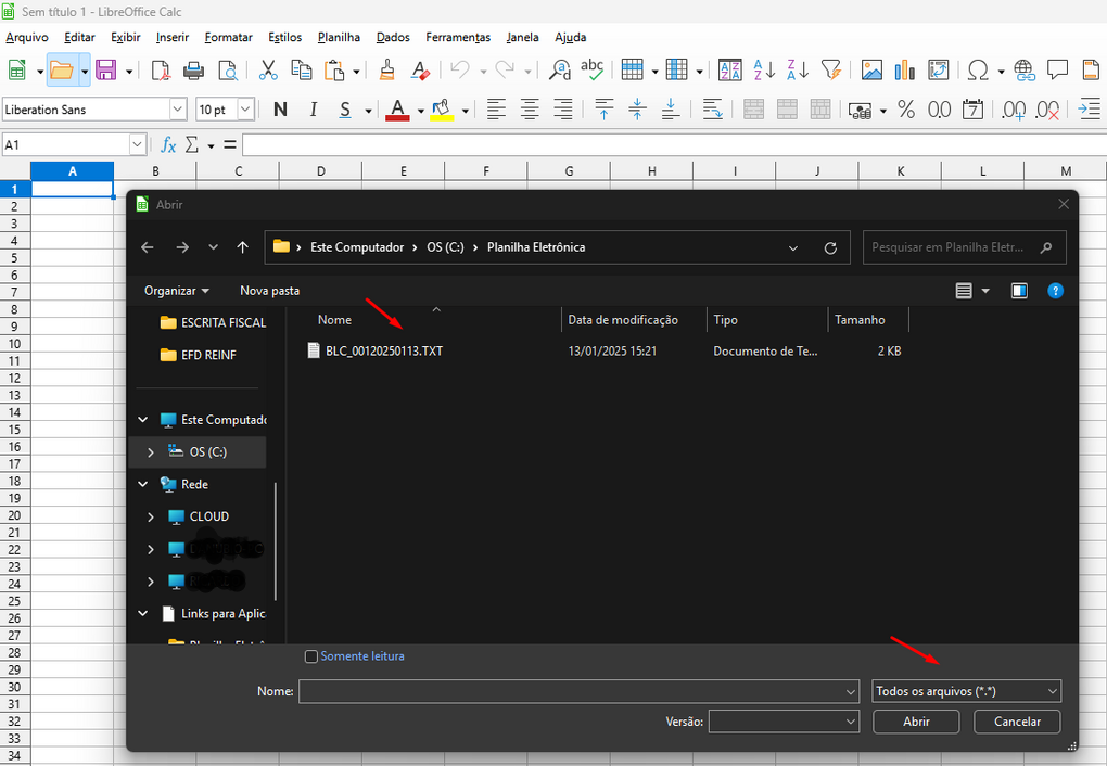 6. Abra o programa utilizado, em Arquivo localize a opção Abrir. Dê sequência e localize o mesmo caminho indicado para salvar o TXT (formato planilha eletrônica);