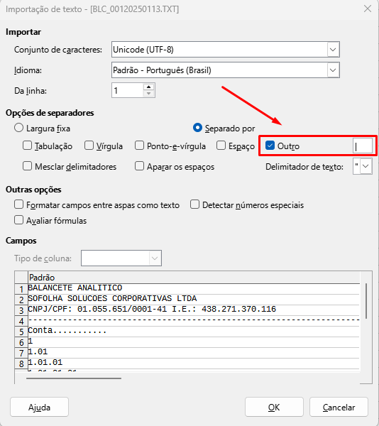 7. Após importar/carregar o arquivo, na tela de Importação de Texto, desmarque todas as configurações, parametrizando apenas a opção Outro com o delimitador | Pipe, conforme a imagem abaixo;