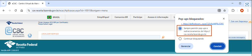 9. Seu navegador poderá bloquear a abertura do MIT, neste caso será necessário dar permissão de abertura de 'Pop-ups'. Clique sobre o botão, selecione a opção Sempre permitir pop-ups e redirecionamentos de https:\\cav.receita.fazenda.gov.br e após em Concluir;