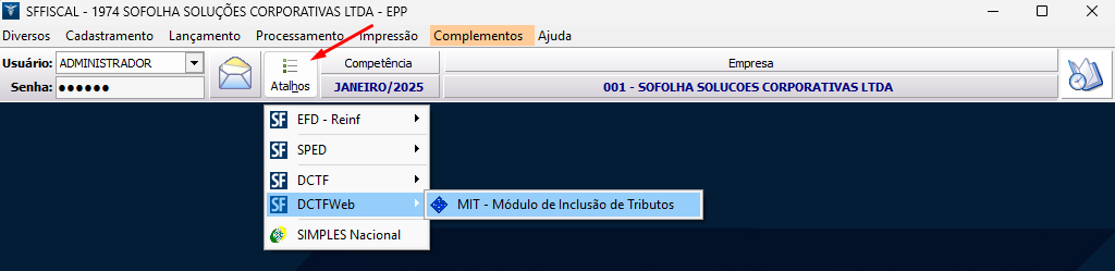 3. Em seguida, acesse a opção Atalhos > DCTFWEB > MIT - Módulo de Inclusão de Tributos;