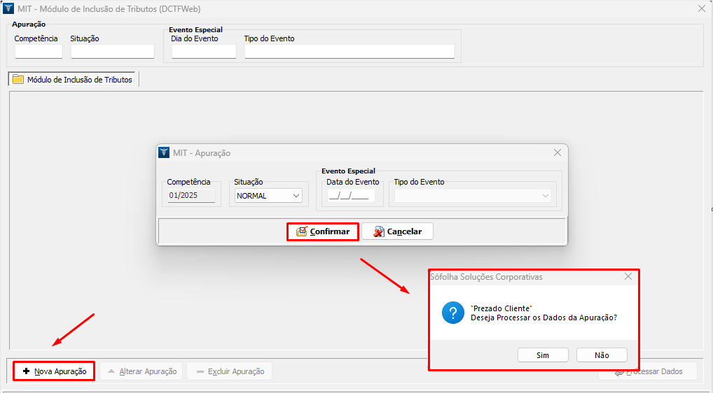 4. Na tela apresentada, clique no rodapé ao lado esquerdo em Nova Apuração e confirme. Na mensagem apresentada, selecione Sim, para processar os dados da apuração;