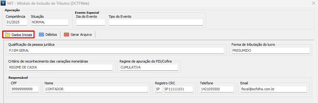 5. Observe os dados gerados nas palhetas "Dados Iniciais e Débitos". Confira se as informações estão corretas, os débitos serão apresentados a partir do processamento dos tributos em Processamento > Apuração de Tributos. O sistema efetuará a geração automática dos débitos PIS, COFINS, IRPJ, CSLL e IPI, demais grupos poderão ser incluídos manualmente na opção Débitos.