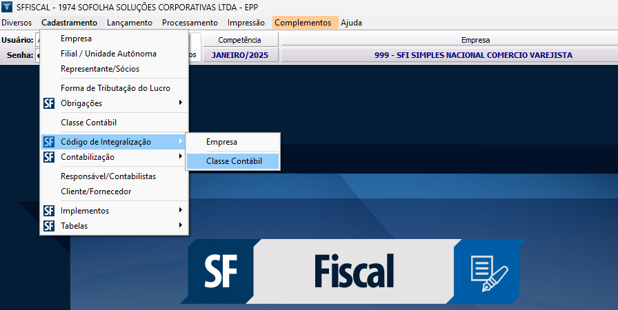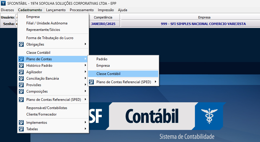 Na imagem abaixo é possível observar como identificar a empresa na Classe Contábil, sempre acompanhada do código + descrição da classe.