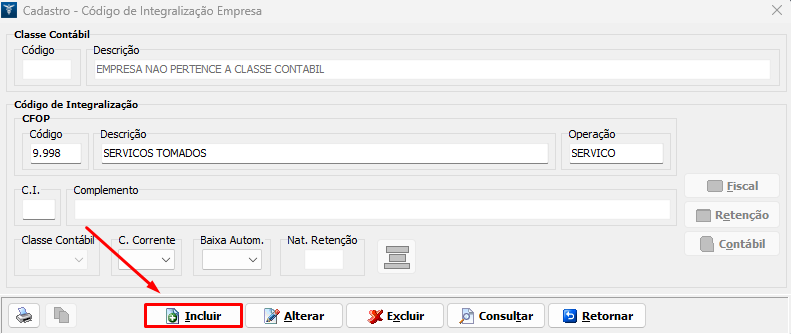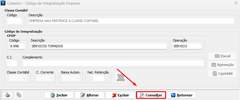 2. No campo Código, digite o CFOP desejado, clique em Consultar e selecione o C.I. que será utilizado;
