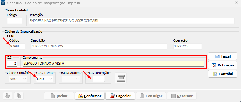 Complemento: É a descrição do C.I., informe a descrição desejada para melhor identificar o código;
