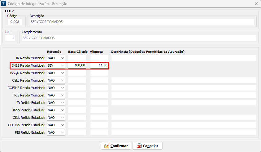 5. Em seguidainforme SIM em cada linha de retenção que deseja habilitar. No exemplo, temos INSS Retido;