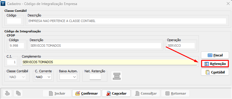 4. Com o C.I. selecionado, em edição, clique ao lado direito, na pasta Retenção;