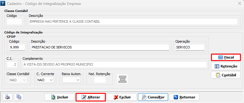 5. Com o CFOP e C.I. selecionados, no rodapé da tela clique em Alterar e após ao lado direito da tela, acesse a pasta Fiscal;