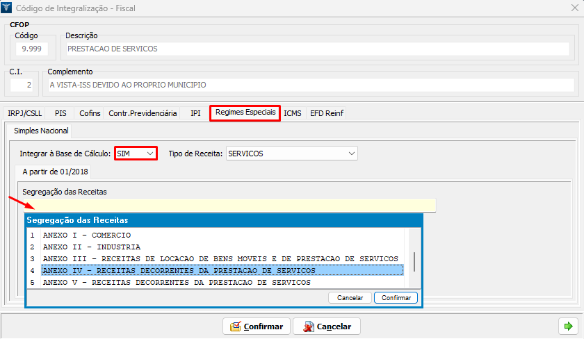 6. Em seguida clique na palheta Regimes Especiais, pressione F9 no campo Segregação das Receitas indicando o anexo da empresa, conforme o exemplo abaixo: